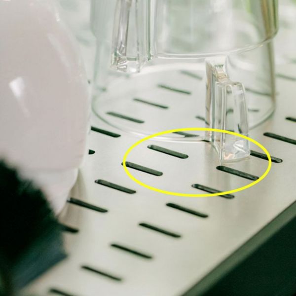 水渍可以顺着这些小孔流入底部的接水盒,它的下水管可以跟水槽的下水管连接,确保橱柜台面上时刻都能保持干净清爽。