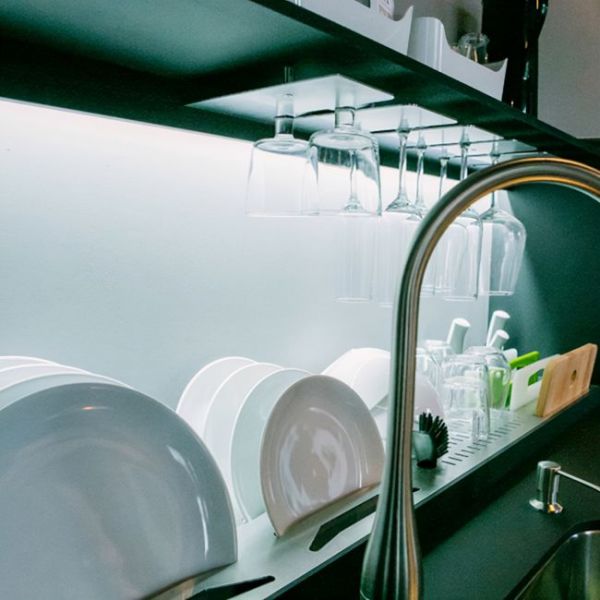简单来说,一个双层沥水架能同时解决橱柜台面上的收纳和照明问题,很适合小橱柜,碗碟刀具和经常用到的瓶瓶罐罐全都放在手边上,随拿随取很方便,相比较将沥水架隐藏在吊柜里,我觉得直接将它隐藏在橱柜台面上更加实用。