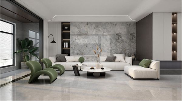 高级白布纹沙发,置于素雅洁净的【卡拉亚斯灰】地砖面,墨绿色R型椅点缀空间。