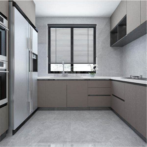 厨房地砖采用【卡特网灰】1500x750mm地砖,一体式的橱柜设计细节满满,合理的橱柜规划也让每一件厨房用品都有自己的归宿。
