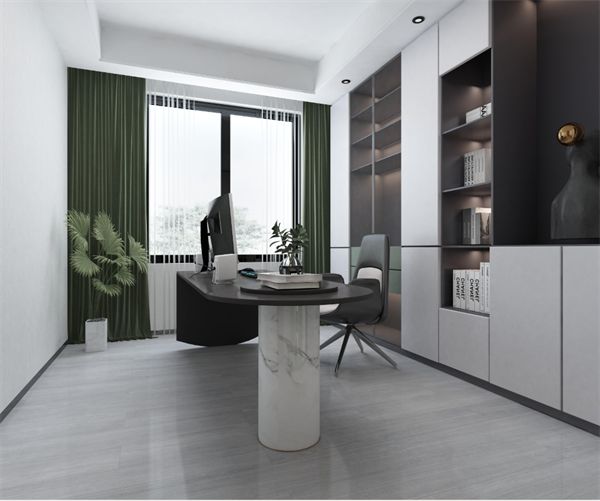“一方书房一方天地”,半透明半封闭储物柜搭配【孚日香橡】地砖,这样的设计视觉统一,减少了封闭感,让空间更轻盈,也便于工作者打开思维。