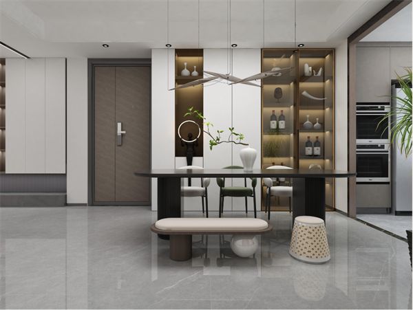 餐厅区域设计尤为简洁,茶色玻璃餐厅柜与天花板相互融合,增加储物空间,有效利用面积,整体空间视野更为开阔。