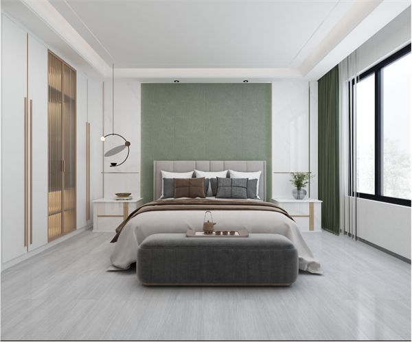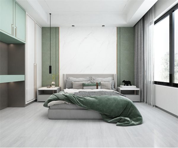 主卧采用推拉门定制衣柜,床头背景墙中间选用绿色布纹,两边拼接平整细腻的白色木饰面,旁侧一抹绿植则为室内增添活力。