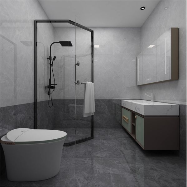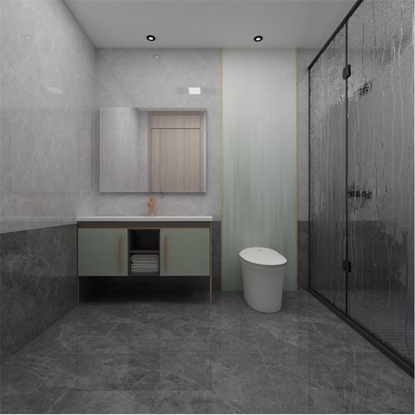 卫浴空间显露优雅格调,半开放半封闭式的浴室柜奠定整个浴室的基调,搭配【山川绣-黛山青】背景墙,各元素配搭十分融洽。