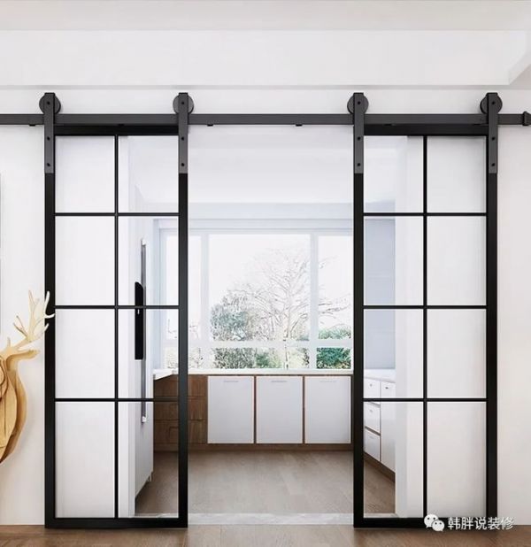 其中比较流行的一种是吊轨门,吊轨门和谷仓门一样的模式。只不过谷仓门多是采用木质的门板,比较厚重,没有办法透光。吊轨门多是采用玻璃门,这样才能保证透光性和视觉效果敞亮。