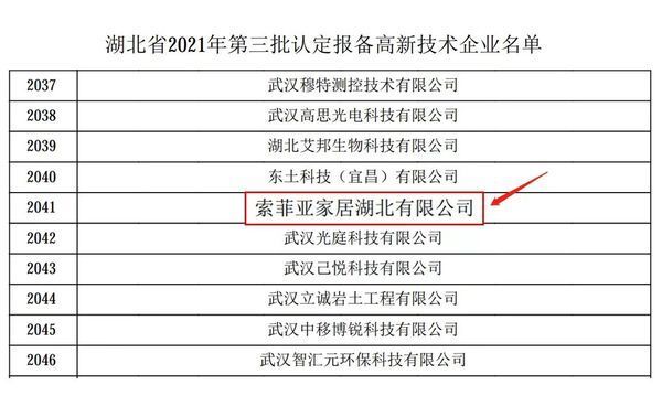 新浪定制频道讯 近日,国家科技部火炬中心公布了湖北省2021年第三批高新技术企业公示名单,索菲亚家居股份有限公司全资子公司——索菲亚家居湖北有限公司入选,获得“高新技术企业”称号。