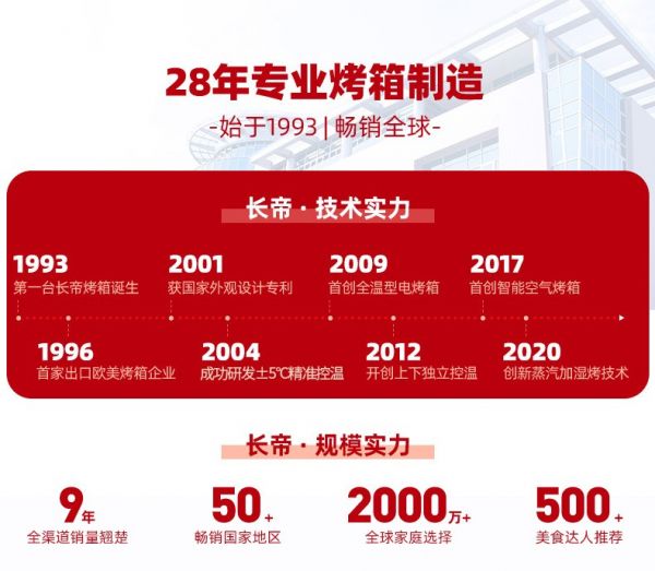 现在无论是在生活中还是网络上,若问到家用电烤箱选哪家,长帝总能成为消费者们优先选择的品牌之一。自1993年诞生了第一台长帝烤箱后,长帝通过提高自主研发技术、积极的用户体验调研、服务升级……创造出一台台深受美食厨艺者、烘焙人喜爱的烤箱。除了畅销国内,长帝烤箱还走进全球2000万家庭的生活,在50个多个国家和地区都能看到它的身影。