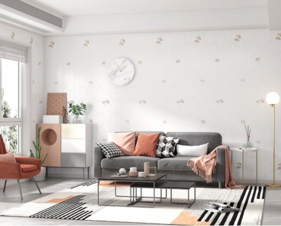 这一系列的产品主推三个色系:珍珠灰、月牙白、桃花粉。简约现代风对墙布的要求就是整体简单但不失精致。这一款墙布主要材料是健康安全的环保无纺布,面料本身并无太多花纹或线条,保留了布料本身的纹理,但是,在这简洁的布料上,用刺绣的工艺缀满了片片银杏叶,浪漫又温暖。