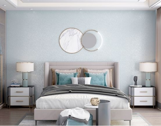 这一款墙布的设计灵感来自茂盛的植物叶片,以植物叶子为灵感,以现代风格为基础,将叶子加以设计,将自然融合到墙布纹理之中,降低视觉冲击,增添天然之美。这款墙布主要色彩有深灰、浅灰、浅黄、浅蓝。高经密提花面料,强韧耐用,表面呈现丝绸般的光泽感,给人一种轻奢的质感,为家居环境添上一缕高级感。其中,浅蓝色那款,极富自然灵动之感,让人仿佛置身于浅海之中,自由飘荡。搭配金属镶边的家具,让整个家居环境轻松舒适又愉悦。