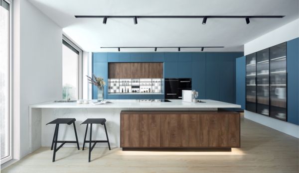 新品云澜更加注重视觉美感与生活美感兼容并包的生活方式,让空间艺术和优雅便捷一并呈现。正所谓优雅为表,从容为里,烤漆材质的云澜新品以其华美的外观性和精美实用性诠释了质感生活应有的模样。云澜的配色是对水墨写意的传承。超哑烤漆色泽优雅,苍蓝遇见柔白,蓝白和谐搭配。同步木纹饰面板自然而不做作,更接近自然木纹的凹凸纹理和花纹彰显出对大自然的敬重。客厅选用多层板贴黑胡桃木皮长城护墙板,让空间澄澈如水。餐厨空间内,岛台下部分地柜古藤棕的饰面纹理搭配石纹岛台,当隐藏的灯光缓缓亮起,心中对家的依恋温暖如初。家的烟火气氤氲出有质感的生活。