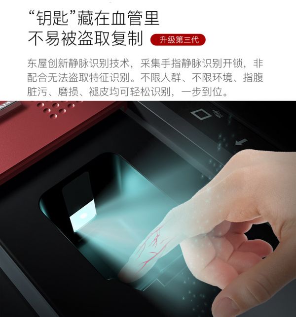 更进一步,就是运用第二代生物识别技术的指静脉锁,因为静脉特征更难伪造,对手指情况要求更低,所以安全性更高。据了解,指静脉锁的工作原理,是利用近红外线穿透手指后所得的静脉纹路影像来进行个人识别,唯一性达到34亿分之一,目前全世界暂无伪造先例,可以说当前民用安全锁里,指静脉锁就是安全性能最好的。
