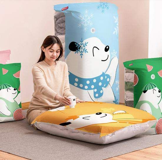 太力四季收纳袋将四季元素融入其中。春天是粉色樱花,夏天是绿色西瓜,秋天是深黄枫叶,冬天是雪花飘落,不同色调再搭配可爱的卡通熊形象,这款太力四季收纳袋在太力电商平台C位上架,无不吸引消费者为其停下瞩目。
