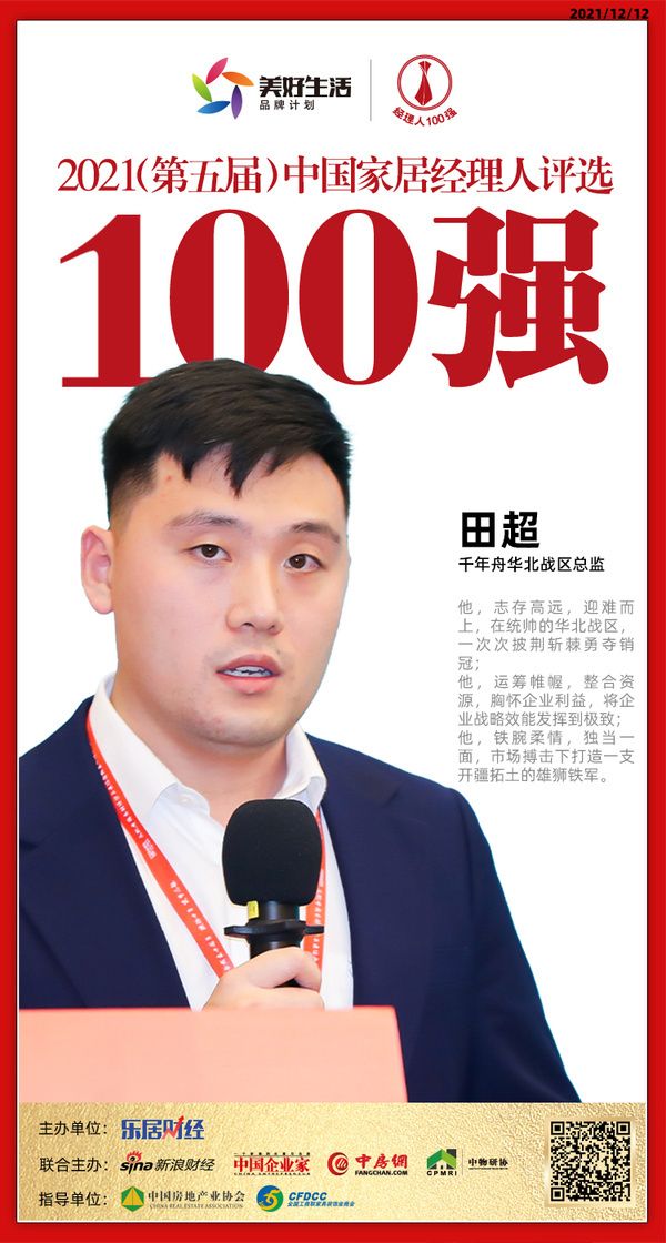 新浪家居讯 12月12日,2021(第五届)中国地产新时代盛典在北京举行,“2021中国家居经理人100强”榜单正式揭晓。千年舟华北战区总监田超荣获“2021中国家居经理人100强”。
