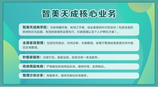 1. 智美天成是国内领先的一站式收纳服务平台,致力于培训服务中国女性创业服务。