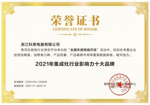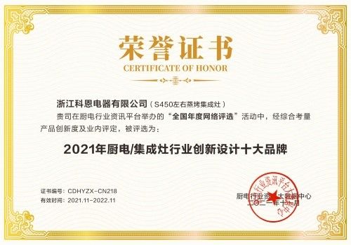 热烈祝贺浙江科恩电器有限公司,荣获2021年集成灶行业影响力十大品牌、2021年集成灶行业消费者好口碑十大品牌、2021年厨电行业影响力十大品牌、2021年厨电/集成灶行业创新设计十大品牌、2021年厨电行业消费者好口碑十大品牌。