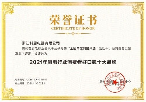 自2021年厨电/集成灶品牌推荐活动启动以来,经过企业筛选、资格初审、后台评论、留言推荐、数据核对、综合评审等阶段。科恩电器凭借强大的综合实力和品牌影响力在厨电行业资讯平台评选中脱颖而出,斩获“十大品牌”五大殊荣!
