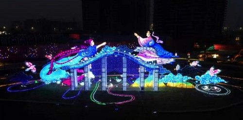 结合淄博的文化特色,本届彩灯节特别打造了一组高10余米的“牛郎织女鹊桥之约”彩灯,气势壮观、精巧别致、瑰丽奇异,极具文化品位与艺术魅力。值得一提的是,因其特殊工艺,此次彩灯艺术节里展现的彩灯,在白天同样光彩夺目,无论是白天还是晚上,都能尽情领略彩灯里的文化底蕴和城市魅力。