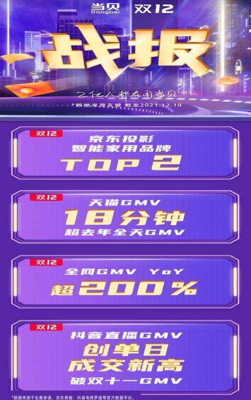 刚刚结束的2021年双十二,作为国内投影仪增速领先品牌——当贝投影仪再创佳绩,全网GMV增长率超200%!据官方战报显示,全网GMV增长率超200%!当贝投影仪荣获京东智能家用投影仪TOP2!天猫GMV,18分钟超去年全天!抖音直播GMV创单日成交新高,破双十一GMV!