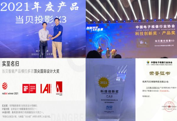 当贝X3凭借创新设计、高性能先后获得2021年iF国际设计大奖、云游戏峰会2021年度产品奖等国内外知名奖项。第十七届中国音视频产业大会荣获中国电子视像行业协会授予的“科技创新奖”,投影仪行业独此一家!