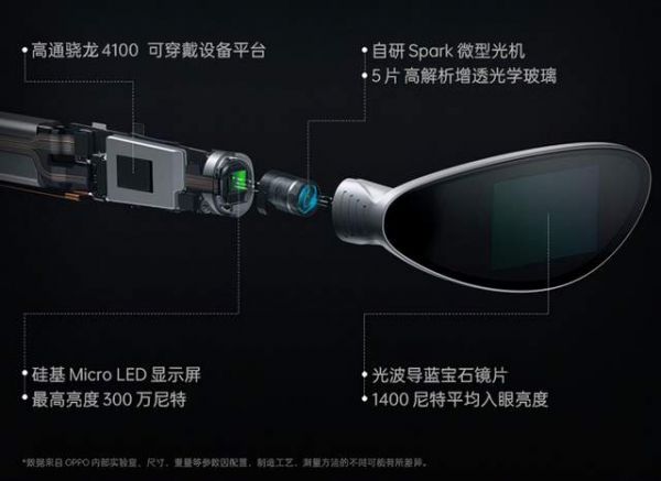 性能方面,OPPO Air Glass搭载了高通骁龙4100可穿戴设备平台,并集成自主研发的Spark微型光机、Micro LED和定制光波导技术。其中Spark微型光机是目前业界最小的光机,体积仅约一粒咖啡豆大小,在有限的体积里Spark微型光机集成了5片高透玻璃镜片,带来了出色的散热性和稳定性。而Micro LED显示技术则拥有高达300万尼特的显示亮度,可以做到在各种复杂光照条件下都提供清晰明亮的显示效果,进一步提升使用体验。