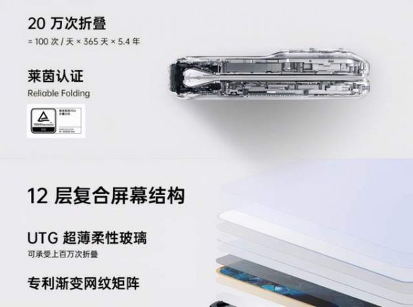 目前市场折叠屏的问题主要集中在屏幕上,对此通过自研精工拟椎式铰链技术,基于0.01mm的超高精度和136个元器件协同配合,让OPPO Find N屏幕弯折时可形成水滴形状,从而有效减轻视觉折痕。经德国莱茵实验室认证,相较传统折叠屏铰链方案,OPPO Find N最高减轻高达80%的视觉折痕,是目前折痕最轻的折叠屏手机。