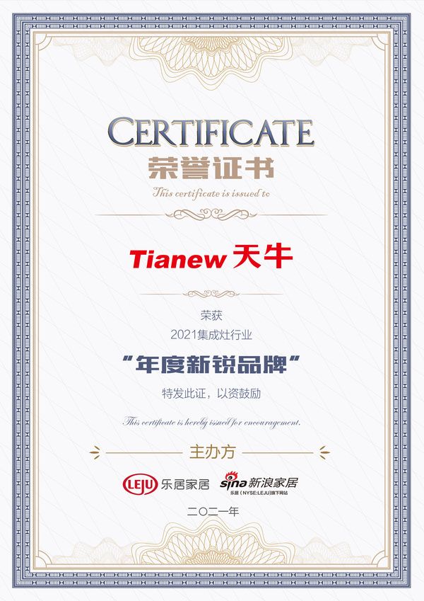 新势力新实力|天牛集成灶荣获新浪家居“2021集成灶行业年度新锐品牌”称号