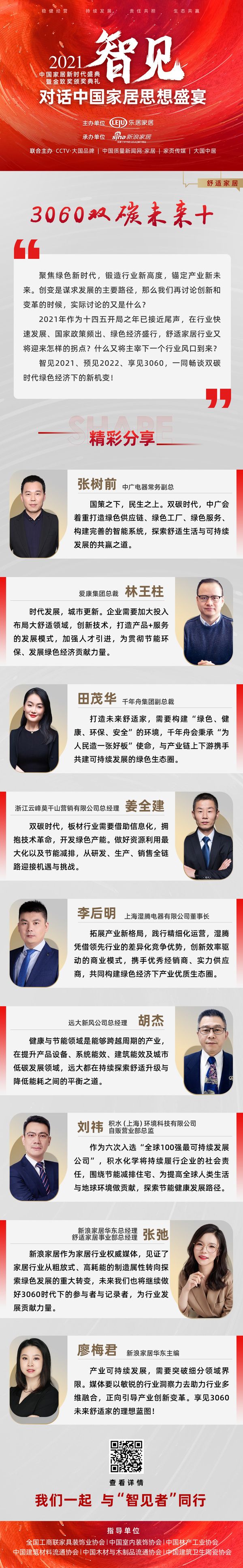 聚焦绿色新时代,锻造行业新高度,锚定产业新未来。作为十四五开局之年,2021已接近尾声,在行业快速发展、国家政策频出、绿色经济盛行,家居行业又将迎来怎样的拐点?企业如何把握下一个行业风口到来?智见2021、预见2022、创见3060,《3060双碳未来+》线上论坛,邀请泛家居行业领军品牌代表参与讨论,围绕“3060双碳背景下的机遇与挑战、绿色经济发展、3060未来舒适家的畅想和规划等重要议题,共探双碳时代绿色经济新机变。