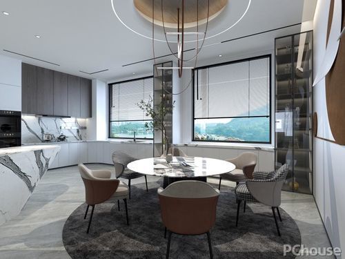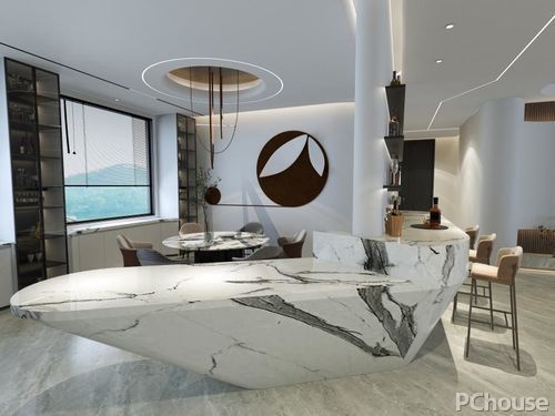 餐厅大胆使用异形吧台设计,将餐厅和品酒区完美连接,大纹理规格的天然石材尽显高级感。超大的玻璃窗,将空间的通透感无限延展。