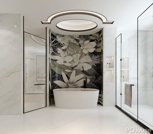 主卫花瓣主题的马赛克浴缸背景墙,让单调的卫浴间多了几分灵动感,强烈的深浅对比,突显空间的层次感。