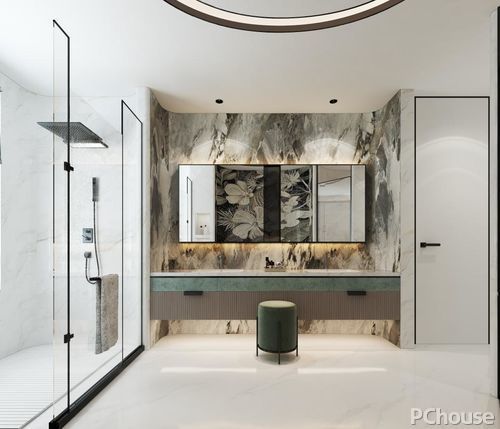 客卫采用线条切割空间,以背景墙的不同展现出干湿两区不一样的氛围,夸张的石纹与素雅的白色对立碰撞,打造卫浴间的高级感。