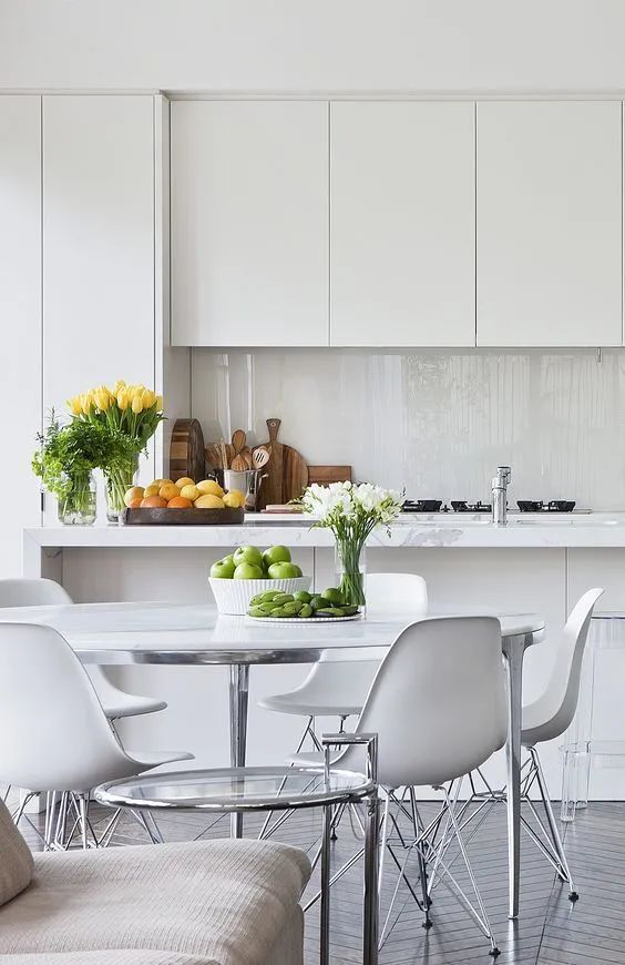 玻璃台面 很受欢迎,因为它们在视觉上不会使空间混乱,但它们不适合厨房。首先,即使是最耐用的玻璃,也迟早会出现划痕。其次,无论你多么小心地把餐具放在桌子上,敲击声还是会响起,把所有的家庭成员都吵醒。