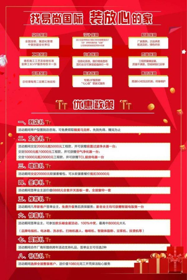 2、定金礼:活动期间交定2000元抵5000元工程款,并可获赠前置过滤净水器一台;交定5000元抵10000元工程款,并可获赠空气净化器一台;交定10000元抵20000元工程款,并可获赠TCL厨房电器一台