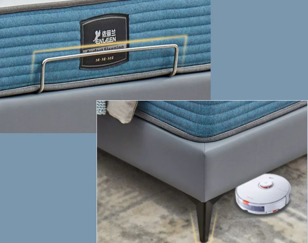 此款床采用13cm菱形金属脚,极简的工业美学设计,八脚支撑更加牢固稳定,方便现代智能生活扫地机器人的清洁需求。床尾贴心设计了不锈钢尾杆和可拆卸支架,让床垫更加牢固,即使在床上打闹也不移位。