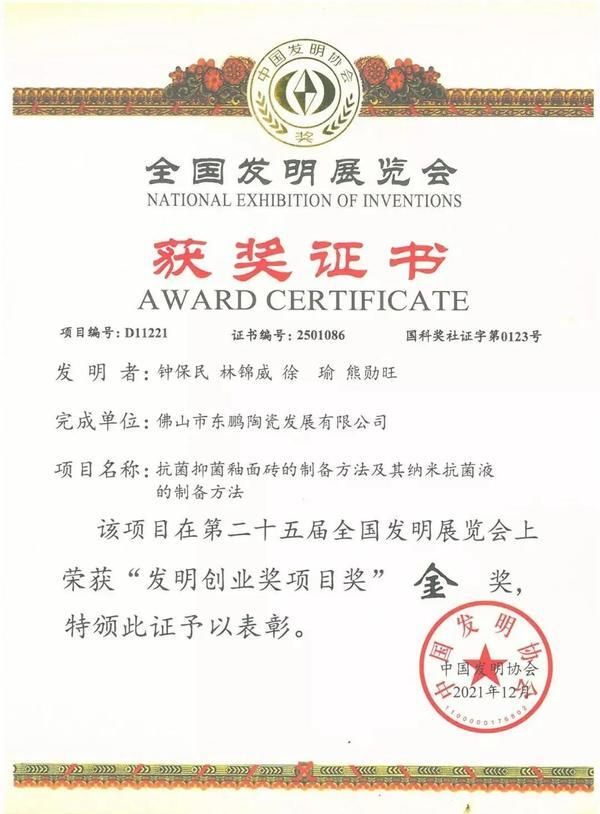 近日,第二十五届全国发明展览会——一带一路暨金砖国家技能发展与技术创新大赛在佛山潭州国际会展中心盛大开幕。本届发明展特设“国家高新技术成果展示专区”“粤港澳大湾区展区”“高等院校发明创新成果专区”等七大展区,共吸引来自全国各地的2300余项发明成果参展,其中东鹏有两项发明成果参加展览展示,分别为:“抗菌抑菌釉面砖(板)”、“金鹏生态石”。经过层层筛选、专家评审“抗菌抑菌釉面的制备方法及其纳米抗菌液的制备方法”项目在第二十五届全国发明展览会上荣获“发明创业奖项目奖”金奖。
