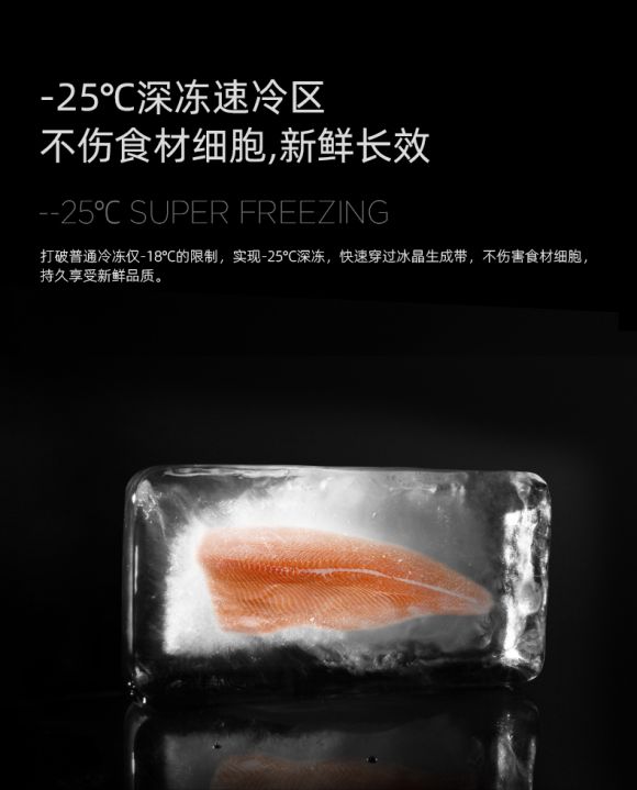 奥马冰箱打破行业低温极限的深冷速冻技术在该系列冰箱中也有搭载。-25摄氏度的超低温度通过特殊工艺打造的金属匀冷背板进行传递,冷冻室的每个角落都均匀的布满超低温度,穿过冰晶生成带给予食材全方位的冷冻,锁住鲜嫩的口感让营养留存更久。