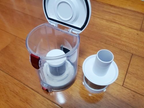 尘盒的清洗是本人使用过的吸尘器里最好清理的一个。按下一键倾倒按钮可以倾倒里面的灰尘,完全不会脏手,还可拿下来直接使用清水冲洗,比那些需要手动拆机的吸尘器方便很多。尘盒的容量升级到了0.8L,一般来说,清洁450㎡的面积倒灰一次即可,也就是说,对于大多数家庭来说,使用四到五次才倒灰一次,避免了频繁倒灰的麻烦。
