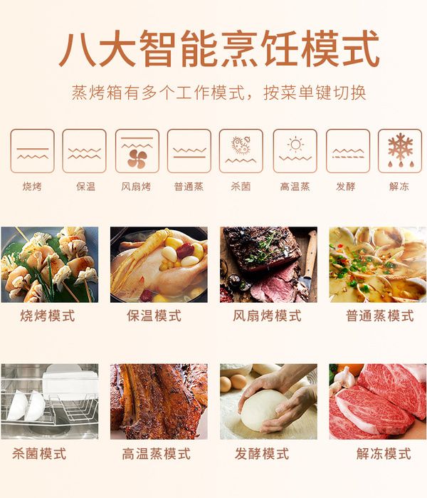 多种烘焙模式,烤牛排、烤鸡、烤面包、粉蒸排骨、剁椒鱼头、冬瓜排骨汤…美味一键拥有,轻松下厨,一切尽在掌握。融贯中西的美食家高端厨房解决方案,满足用户对智慧烹饪、健康饮食的需求。