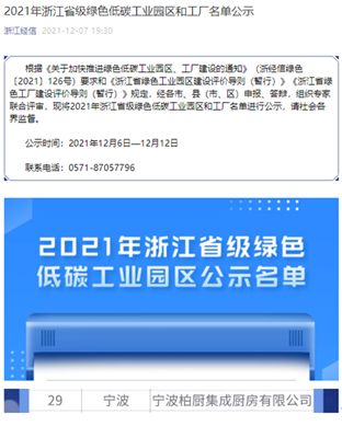 创新工业引领 柏厨家居荣登浙江省工信厅公布的“2021年浙江省级绿色低碳工业园区和工厂