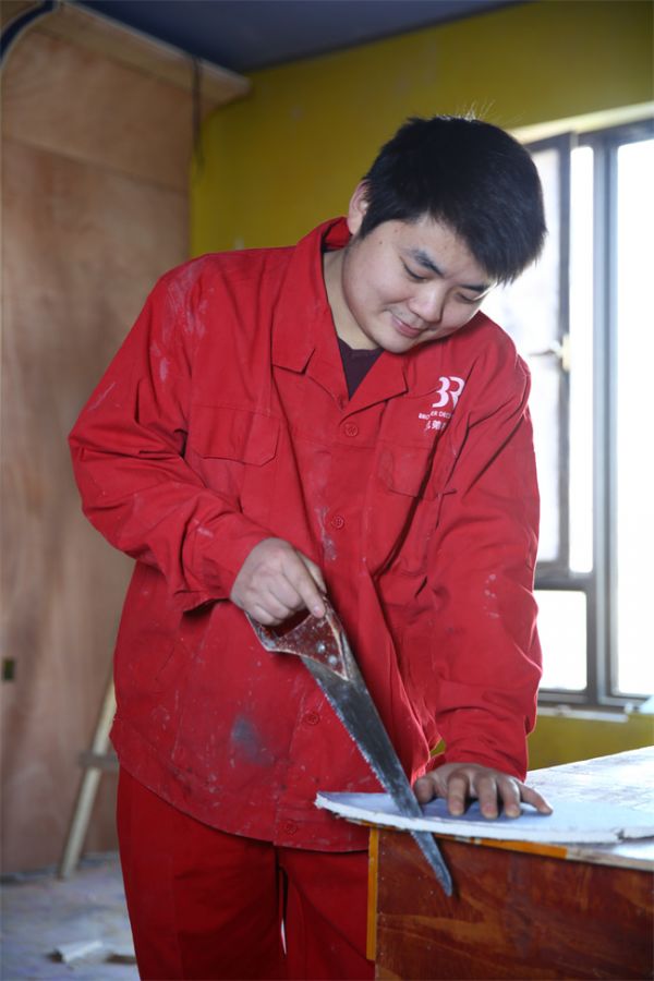 大多数从事家庭装修施工技艺的工人都是子承父业,或者是亲朋好友的介绍,杨飞就是其中一个。“因为父亲是木工,毕业后就一直跟随父亲学习,我认为干一行就要爱一行,每一行只要用心专研都能干出名堂。”