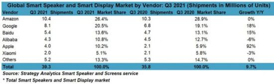 Strategy Analytics 统计,苹果在 2021 年第三季度出货了 400 万台智能音箱,占据了智能音箱和智能屏幕市场 10.2% 的份额。该研究公司表示,谷歌的 Nest Mini 是该细分市场中最畅销的设备,其次是 HomePod mini 和亚马逊的第四代 Echo Dot。