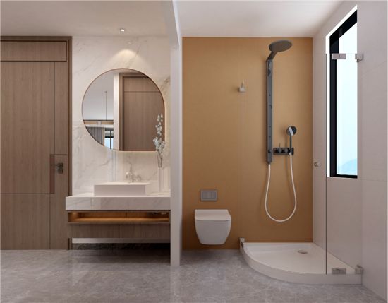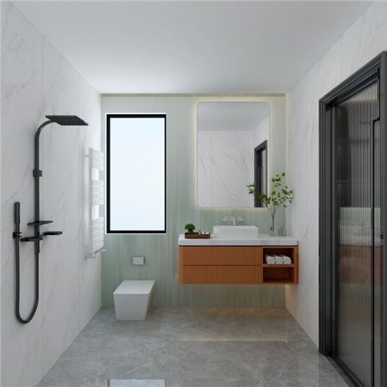 廖娟了解到,客户的新居是一套别墅。针对别墅高端大气的特点,她从大规格岩板入手,为客户深度介绍欧神诺岩板的特点以及优势,引发客户的兴趣,逐步拉近与客户的距离。在沟通中,客户说到:别墅一楼的卫生间家里的老人也会用,针对护眼、抗菌等需求廖娟推荐了YBFCS12590180EA 威尼斯灰,柔光护眼,抗菌功能更能呵护老人和小孩的使用健康。