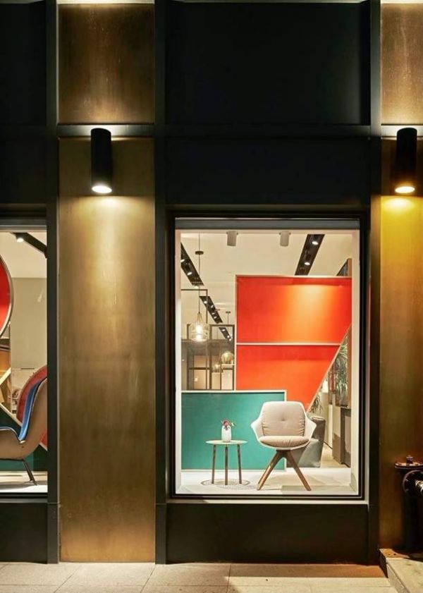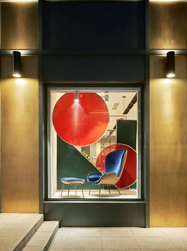 绿色,时尚圈近年流行色,红色,亦呈现古典精致感。当红绿色,搭配包豪斯几何元素,为空间增添难以模仿的神秘气质。设计师一改沉闷的命名风格,以几何图形与家居组合成品牌名「字母」,让橱窗空间暗藏注脚。