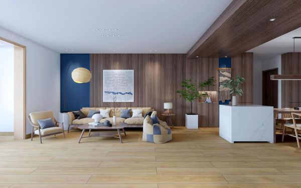 北欧风格简约却不简单,看似无意却深含巧思的搭配往往让人印象深刻,空间中总有让人眼前一亮的视觉中心。由于北欧风格不喜复杂夸张的造型,所以这种整体空间中凸显的视觉中心往往用颜色来形成跳跃感。比如上图中虽然还是白色、灰色的经典组合搭配,但是设计师巧妙的用大面积蓝色块来装饰墙面,对空间的功能性进行了巧妙的分割,又大大提升了空间的自由度与时尚感。会客区也是同样的道理,在两组灰色大沙发映衬下,豆沙红色的单椅格外引人注目,让稳定的空间形成了更丰富的视觉效果。空间有大面积色块的情况下,地板的选择要格外注意。颜色方面,卢森地板雪朗橡木属于灰调中偏暖的地板,选择灰调地板这与空间整体氛围保持一致,同时偏暖的视觉感受又符合我们对“家”的定义。
